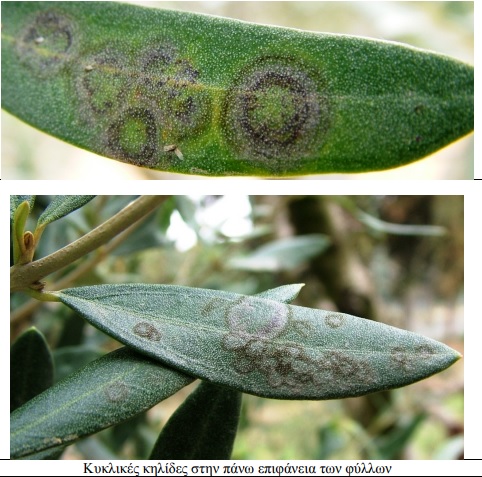 Το Κυκλοκόνιο προσβάλλει κυρίως τα φύλλα, σχηματίζοντας χαρακτηριστικές κυκλικές κηλίδες στην πάνω επιφάνεια. Τα κηλιδωμένα φύλλα κιτρινίζουν και πέφτουν πρόωρα. Σε σοβαρές προσβολές προκαλείται φυλλόπτωση και καρπόπτωση και τα δένδρα οδηγούνται σε καχεξία. Οι βροχοπτώσεις των τελευταίων ημερών σε συνδυασμό με τις αντίστοιχες θερμοκρασίες, βοήθησαν την βλάστηση των κονιδίων του μύκητα. Σε δειγματοληψίες φύλλων που πραγματοποιήθηκαν σε αψέκαστους ελαιώνες της περιοχής μας, διαπιστώθηκαν ενεργά κονίδια σε μικρό ποσοστό.