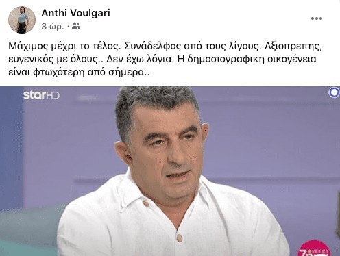 Μέσα από τον προσωπικό της λογαριασμό στο Facebook, η Ανθή Βούλγαρη θέλησε να εκφράσει με τη σειρά της την βαθιά της θλίψη για την απώλεια του καλού της συναδέλφου. Πιο συγκεκριμένα, η δημοσιογράφος και παρουσιάστρια της καθημερινής εκπομπής «Κοινωνία ώρα MEGA» σημείωσε χαρακτηριστικά «Μάχιμος μέχρι το τέλος. Συνάδελφος από τους λίγους. Αξιοπρεπης, ευγενικός με όλους».