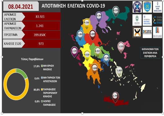 Οι αρμόδιες ελεγκτικές υπηρεσίες (ΕΛΑΣ, Λιμενικό Σώμα, ΕΑΔ, ΔΙΜΕΑ, ΣΕΠΕ, Περιφέρειες και Δημοτική Αστυνομία) διενήργησαν την Πέμπτη 8 Απριλίου 2021 συνολικά 83.921 ελέγχους και κατέγραψαν 1.243 περιπτώσεις παραβίασης των μέτρων επιδημιολογικού συναγερμού.