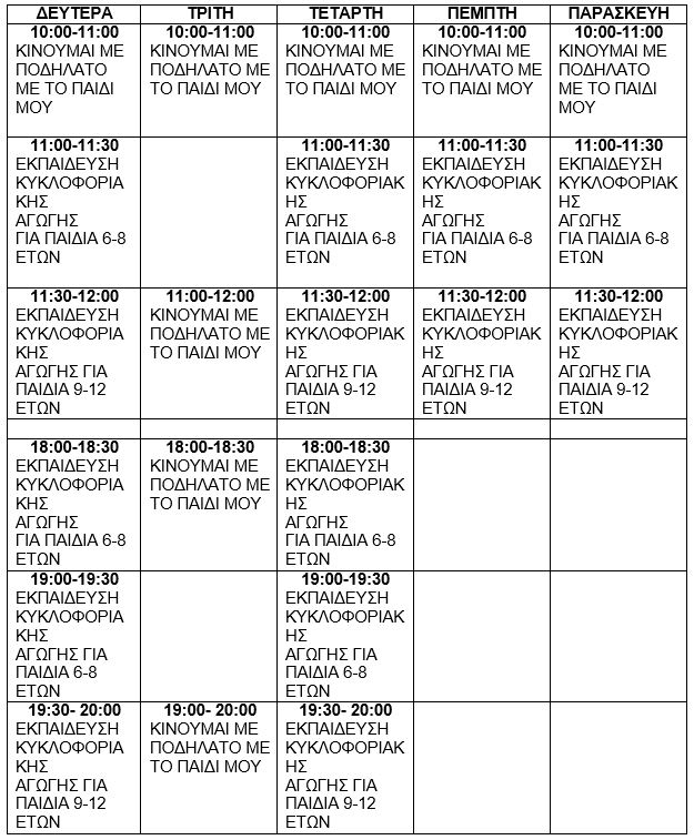 Τα προγράμματα ονομάζονται «Κινούμαι με ποδήλατο με το παιδί μου» και απευθύνεται σε γονιό και παιδιά και «Eκπαίδευση κυκλοφοριακής αγωγής για παιδιά» που απευθύνεται σε μικρές ομάδες παιδιών.