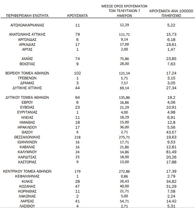 Ακόμα, η Αχαΐα καταγράφει 74 νέες επιβεβαιωμένες μολύνσεις και η Κοζάνη 47.