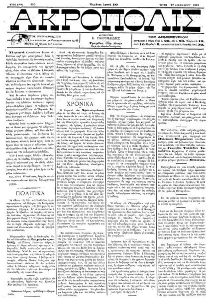 Συνέχεια του εν λόγω περιοδικού, από την 1η Νοεμβρίου 1883, υπήρξε η πρωινή εφημερίδα γνώμης «Ακρόπολις», η οποία υπήρξε πρωτοποριακή από την άποψη της εμφάνισης, της ύλης, αλλά και του τεχνολογικού εξοπλισμού της.