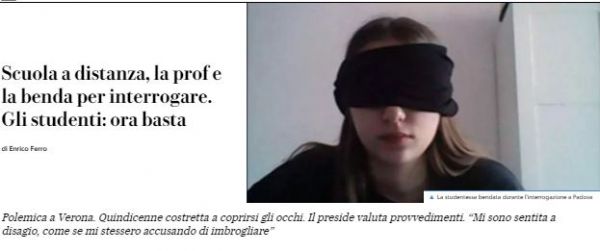 Καθηγήτρια σε ιταλικό σχολείο υποχρέωσε μαθήτρια να κλείσει τα μάτια της με μαντήλι κατά τη διάρκεια εξέτασης σε μάθημα εξ αποστάσεως για να μην «κλέψει», ενώ το περιστατικό προκάλεσε την οργή της εκπαιδευτικής κοινότητας, γράφει σήμερα ο ιταλικός Τύπος.