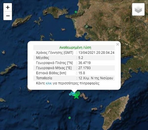 Η σεισμική δόνηση μεγέθους 5,2 βαθμών της κλίμακας ρίχτερ σημειώθηκε ανάμεσα σε Τήλο και Νίσυρο. Το επίκεντρο του σεισμού σύμφωνα με το Γεωδυναμικό Ινστιτούτο εντοπίστηκε 12 χιλιόμετρα νότια της Νισύρου. Το εστιακό του βάθος μετρήθηκε στα 15,8 χιλιόμετρα.