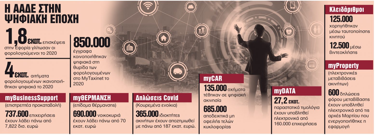Με το ξέσπασμα της πανδημίας, τον περασμένο Μάρτιο η ΑΑΔΕ ενεργοποίησε νέες ψηφιακές υπηρεσίες για τις συναλλαγές των φορολογούμενων. Περισσότεροι από 4 εκατομμύρια πολίτες και επιχειρήσεις εξυπηρετήθηκαν ψηφιακά από την ΑΑΔΕ κατά το 2020, με αποτέλεσμα οι φορολογούμενοι να γλιτώσουν πάνω από 1,8 εκατ. επισκέψεις στην Εφορία στο διάστημα αυτό. «Δώσαμε μια πολύ δύσκολη μάχη για την εξυπηρέτηση των πολιτών εν μέσω πανδημίας, ό,τι καταφέραμε βασίστηκε στην ψηφιοποίηση που υπήρχε ήδη πριν από το ξέσπασμα της κρίσης», δήλωσε ο επικεφαλής της ΑΑΔΕ για να προσθέσει ότι το 2021 προγραμματίζεται σειρά νέων έργων αναβάθμισης των ψηφιακών υπηρεσιών με τη συνδρομή των πόρων του Ταμείου Ανάκαμψης μεταξύ των οποίων περιλαμβάνονται:
