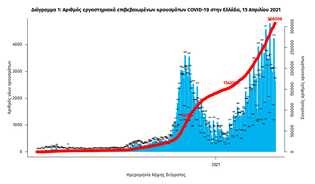 Τα νέα εργαστηριακά επιβεβαιωμένα κρούσματα της νόσου που καταγράφηκαν τις τελευταίες 24 ώρες είναι3.833, εκ των οποίων 16 εντοπίστηκαν κατόπιν ελέγχων στις πύλες εισόδου της χώρας.
