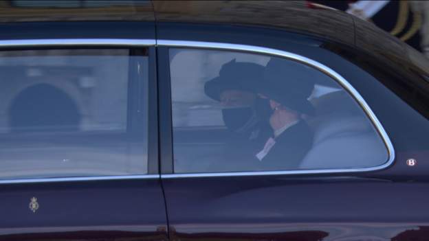 Η βασίλισσα συντετριμμένη, αναχώρησε από την Είσοδο του Μονάρχη με το αυτοκίνητο που είναι γνωστό ως State Bentley και έφτασε στο πίσω μέρος της πομπής.