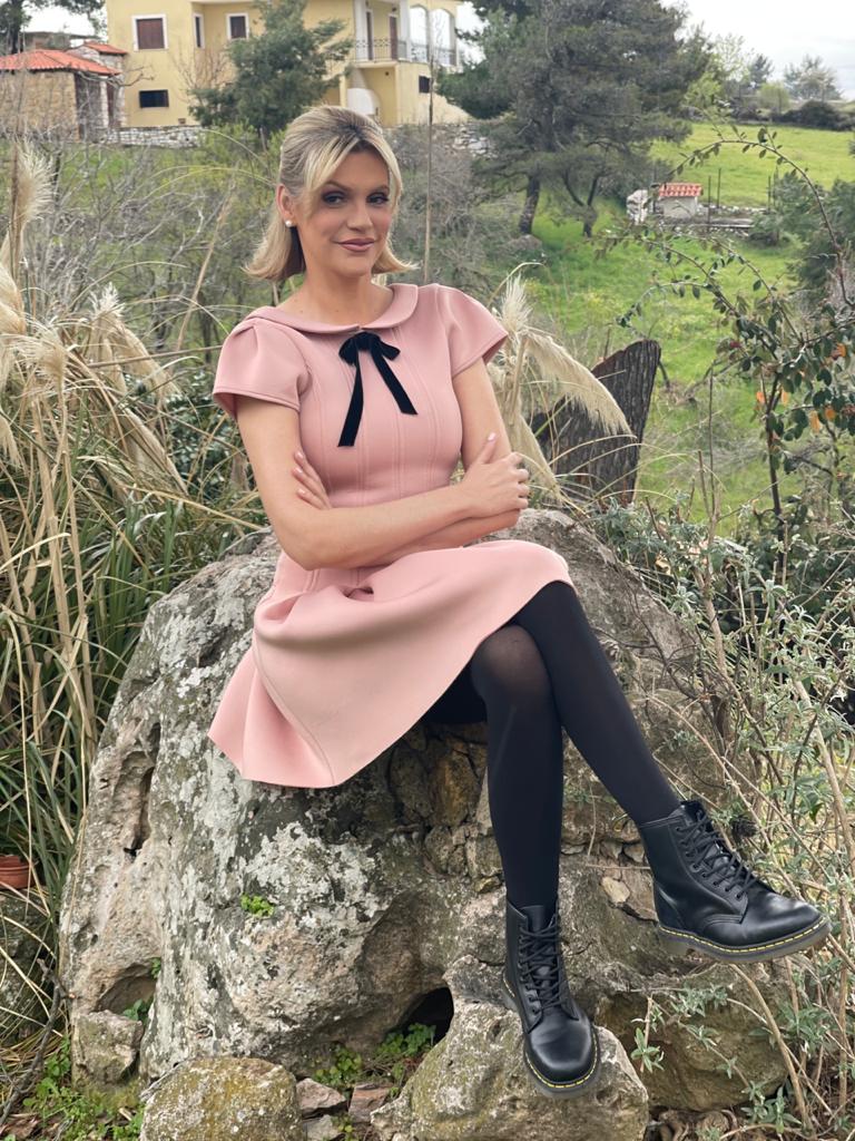 Στη δεύτερη εμφάνισή της «παντρεύει» τα Martins μποτάκια της με ένα κοντό φόρεμα της Σίλιας Κριθαριώτη από τη σειρά 5226 και το απαραίτητο αδιαφανές μαύρο καλσόν.