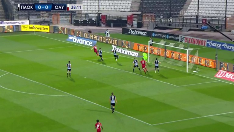 Μεγάλη ευκαιρία είχε ο Ολυμπιακός για να πάρει προβάδισμα στην Τούμπα με τον Μασούρα στο 29′.