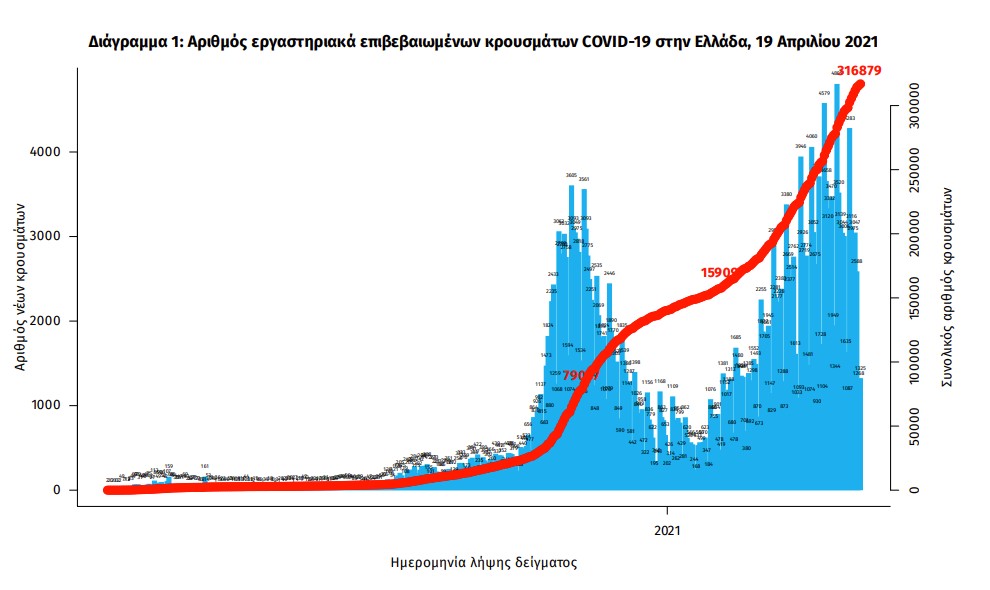 Τα νέα εργαστηριακά επιβεβαιωμένα κρούσματα της νόσου που καταγράφηκαν τις τελευταίες 24 ώρες είναι 1.607, εκ των οποίων 7 εντοπίστηκαν κατόπιν ελέγχων στις πύλες εισόδου της χώρας. Ο συνολικός αριθμός των κρουσμάτων ανέρχεται σε 316.879 (ημερήσια μεταβολή +0.5%), εκ των οποίων 51.3% άνδρες