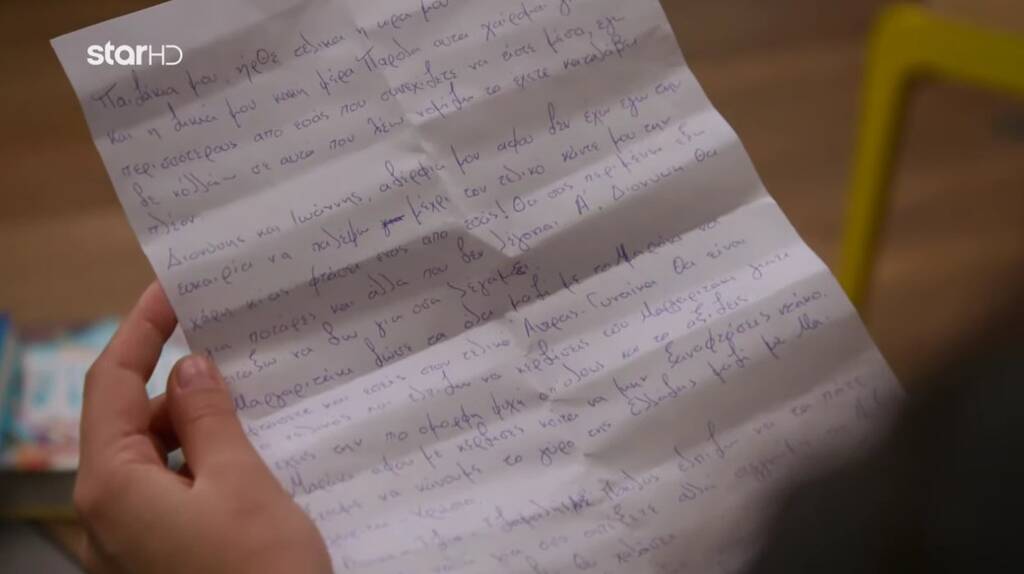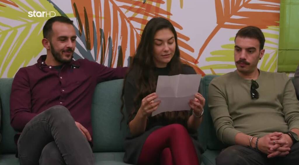 «Αδέρφια μου, αφού δεν έχω εγώ την ευκαιρία να φτάσω μέχρι τον τελικό, κάντε μου τη χάρη να φτάσει ένας από εσάς. Σας περιμένω έξω. Διονύση θα κοιτάξω να δω για όσα λέγαμε… Μαργαρίτα, δώσ’τα όλα μαζί με τη Μαρία να φτάσετε κι εσείς στον τελικό. Άνδρας – Γυναίκα θα πάνε στον τελικό και ελπίζω να κερδίσει εσύ Μαργαριτάκι γιατί έχεις την πιο όμορφη ψυχή απ’ όλους και το αξίζεις. Μαράκι, αφού με κέρδισες, κοίτα να μην ξαναφτάσεις στην ψηφοφορία. Έχουμε να κάνουμε τον γύρο της Ελλάδος, μαζί με την Μαργαρίτα και τον Χρήστο» ανέφερε μεταξύ άλλων στο γράμμα του.