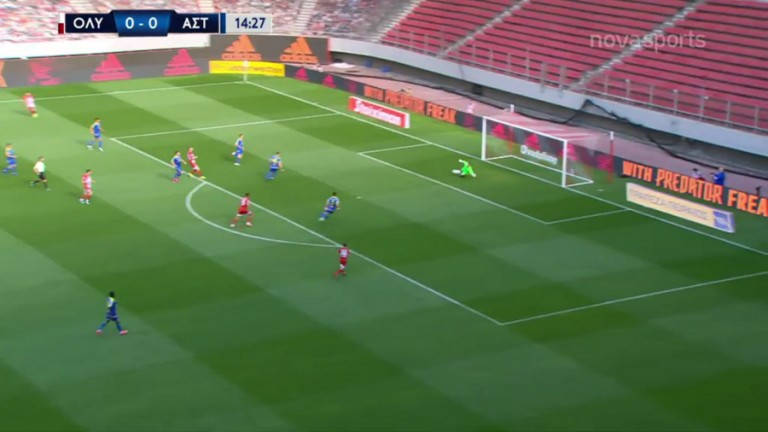 Μεγάλη ευκαιρία για να ανοίξει το σκορ κόντρα στον Αστέρα Τρίπολης έχασε ο Ολυμπιακός με τον Κάιπερς στο 15′.