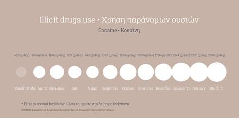 Συγκεκριμένα, η χρήση κοκαΐνης έχει φτάσει να είναι 3 φορές μεγαλύτερη από την αρχή της πανδημίας, ενώ το 2020 φαίνεται να είναι η χρονιά με την μεγαλύτερη χρήση κοκαΐνης εδώ και μια δεκαετία. Αναλυτικότερα, τονΜάρτιο του 2019 η κατανάλωση κοκαΐνης ήταν 482 γρ. την ημέρα, ενώ στο πρώτο lockdown τον Μάρτιο του 2020, φτάσαμε σε διπλασιασμό (804 γρ/ημέρα) και στο δεύτερο lockdown τον Νοέμβριο του 2020 σε τετραπλασιασμό, δηλαδή 1837 γρ. ημερησίως. Η αύξηση όμως συνεχίστηκε φτάνοντας τον Μάρτιο του 2021, σεχρήση 2.396 γρ. ημερισίως!