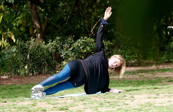 Το πρώην μοντέλο και νυν επιχειρηματίας εμφανίστηκε χωρίς ίχνος μακιγιάζ, με αθλητικό αλλά κομψό look και έκανε τις ασκήσεις της με τη βοήθεια και την καθοδήγηση του προπονητή της.
