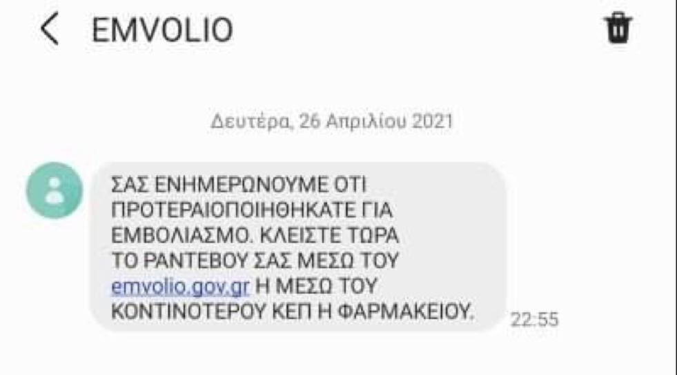 Σας ενημερώνουμε ότι προτεραιοποιηθήκατε για εμβολιασμό. Κλείστε τώρα το ραντεβού σας μέσω του embolio.gov.gr ή μέσω του κοντινότερου ΚΕΠ ή φαρμακείου».