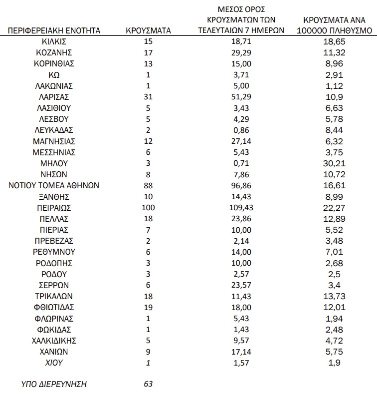 Τέλος, διψήφιο αριθμό κρουσμάτων καταγράφουν η Δυτική Αττική και τα νησιά του Αργοσαρωνικού με 36 και 8 μολύνσεις αντίστοιχα.