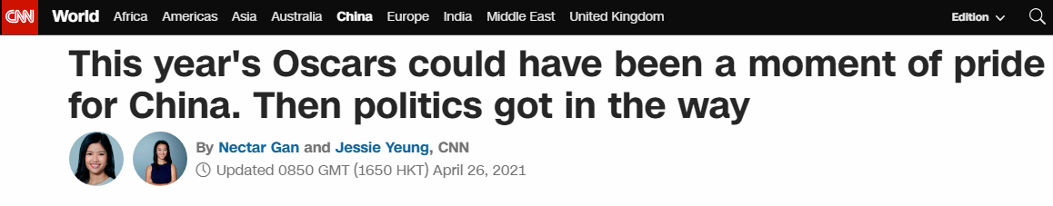 «Η νίκη της Ζάο στα Οσκαρ 2021 ντροπιάζει την Κίνα» είναι το τίτλος του άρθρου της γαλλικής ιστοσελίδας, με τον συντάκτη να επιχειρεί να εξηγήσει γιατί στην ασιατική χώρα η νίκη της Ζάο πέρασε… στα ψιλά.