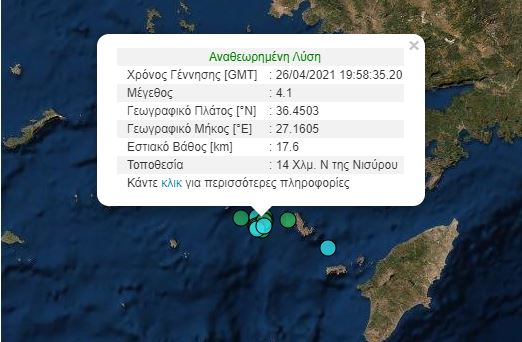 Το επίκεντρο της δόνησης εντοπίζεται στο θαλάσσιο χώρο 14 χιλιόμετρα νότια της πόλης της Νισύρου.