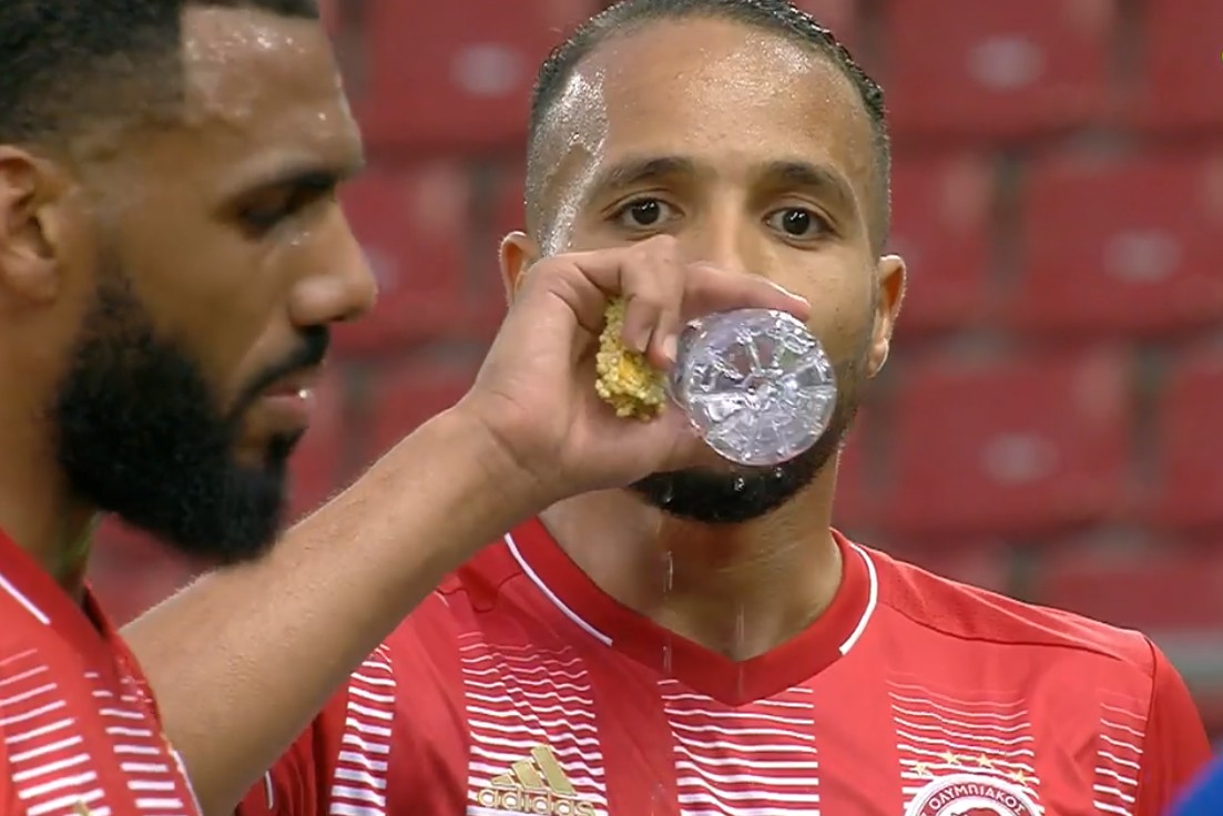 Ο Μαροκινός Γιουσέφ Ελ Αραμπί, ο Γάλλος Γιαν Εμβιλά, ο Γουινέζος Μαντί Καμαρά, ο πορτογάλος Μπρουμά που βρίσκονταν εντός αγωνιστικού χώρου και ο επίσης Γάλλος Κένι Λαλά που βρισκόταν στον πάγκο, παίκτες του Ολυμπιακού, συγκεντρώθηκαν στη γραμμή του πλάγιου άουτ γύρω από τον πορτογάλο διατροφολόγο της ομάδας, Ερνάνι Γκόμεζ για να πιουν νερό και να φάνε κάτι.