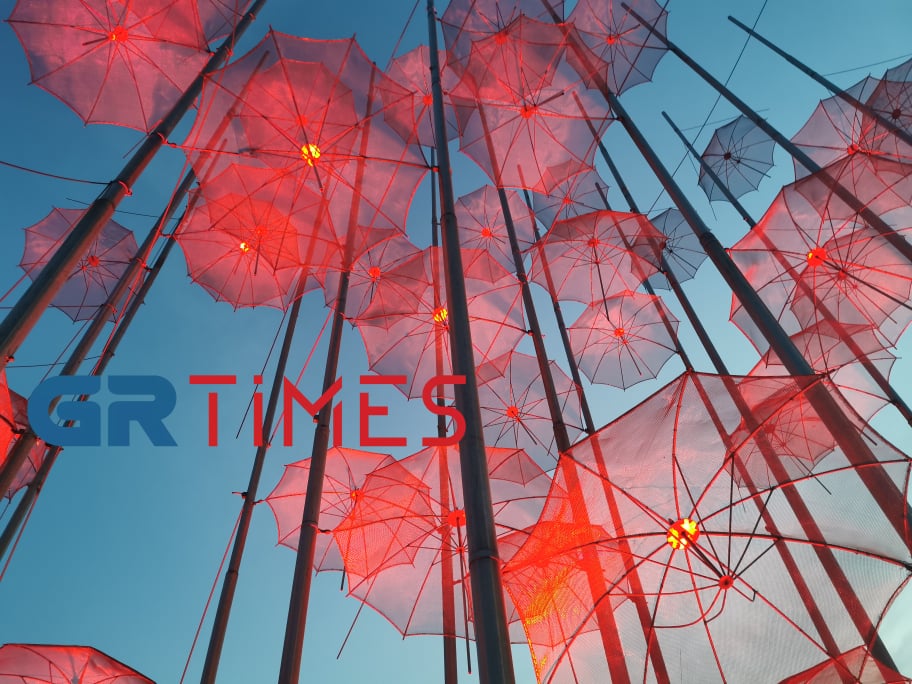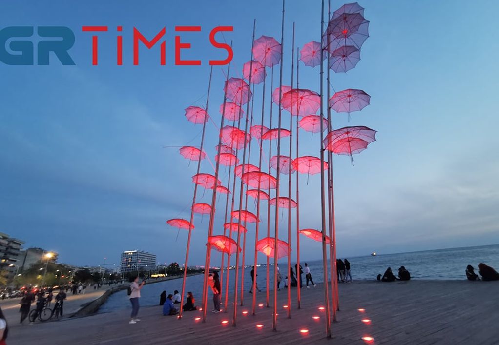 Με τα χρώματα του Πάσχα φωτίστηκαν απόψε οι «Ομπρέλες» του Ζογγολόπουλου στη Νέα Παραλία της Θεσσαλονίκης, με πρωτοβουλία του δημάρχου Κωνσταντίνου Ζέρβα.