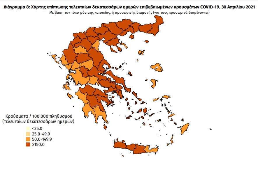 Με βάση τα επιβεβαιωμένα κρούσματα των τελευταίων 7 ημερών, 51 θεωρούνται σχετιζόμενα με ταξίδι από το εξωτερικό και 2.109 είναι σχετιζόμενα με ήδη γνωστό κρούσμα.