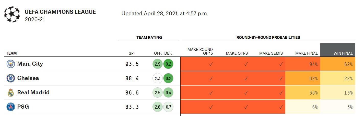 Ποιες είναι όμως οι πιθανότητες των τεσσάρων ομάδων να περάσουν στον τελικό και ποιες να κατακτήσουν το βαρύτιμο τρόπαιο μετά τους πρώτους αγώνες της ημιτελικής φάσης; Η ιστοσελίδα projects.fivethirtyeight έβαλε κάτω όλα τα δεδομένα και έβγαλε τα παρακάτω αποτέλεσμα. Η Μάντσεστερ Σίτι έχει 94.0% πιθανότητες να βρεθεί στον τελικό και 62% να κατακτήσει τον τίτλο. Η Τσέλσι είναι στη δεύτερη θέση με 62% πιθανότητες να περάσει στον τελικό και 22% να πάρει το βαρύτιμο τρόπαιο. Στην τρίτη είναι η Ρεάλ με 38% και 13% αντίστοιχα και στην τέταρτη θέση η Παρί με 6% και 3%.
