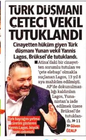 Πανηγυρίζουν τα τουρκικά μέσα ενημέρωσης για τη σύλληψη, εξαιτίας της καταδίκης του για διεύθυνση εγκληματικής οργάνωσης, του χρυσαυγίτη ευρωβουλευτή Γιάννη Λαγού, στις Βρυξέλλες.