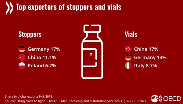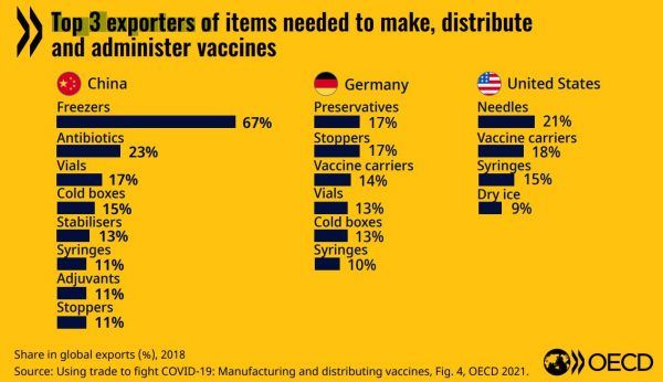 Η Κίνα που κατέχει το 67% των εξαγωγών καταψυκτών, το 23% των αντιβιοτικών, το 17% φιαλιδίων και το 15% των σταθεροποιητών. Η Γερμανία κατέχει το 17% των εξαγωγών σε συντηρητικά και πώματα φιαλιδίων, και το 14% σε κουτιά μεταφοράς εμβολίων. Ενώ οι ΗΠΑ προηγούνται στις βελόνες με 21%, στα κουτιά μεταφορά εμβολίων με 18% και στις σύριγγες με 15%.