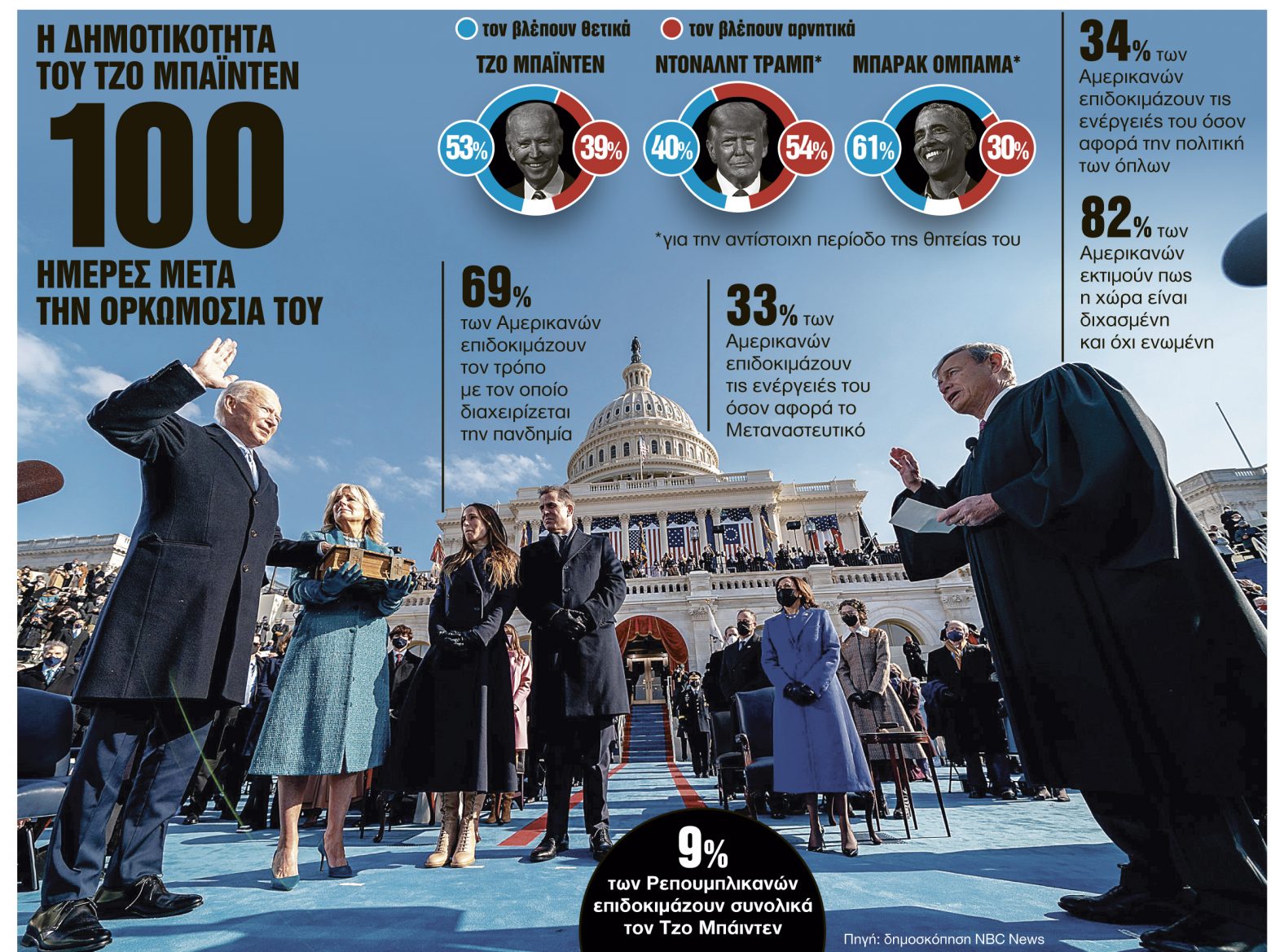 Σε μια πρόσφατη διαδικτυακή συζήτηση στον ιστότοπο FiveThirtyEight, τέσσερις αναλυτές κλήθηκαν να αποκαλύψουν το ένα πράγμα που τους έκανε τη μεγαλύτερη εντύπωση από τις πρώτες 100 ημέρες του Μπάιντεν. Η Τζούλια Αζάρι είπε πως εξεπλάγη από το πόσο ξεκάθαρα επέστρεψε το εκκρεμές μετά την προεδρία Τραμπ, από το πόσο μη επεισοδιακή και μη χαώδης είναι μέχρι στιγμής αυτή η προεδρική θητεία. Η Σάρα Φρόστενσον σχολίασε πως της έκανε εντύπωση το πόσο αριστερά μετακινήθηκε το Δημοκρατικό Κόμμα επί Τραμπ και πόσο πιο φιλελεύθερο είναι επί Μπάιντεν, πεμπτουσίας του μετριοπαθούς Δημοκρατικού. Ο Πέρι Μπέικον «κρατά» πρωτίστως το γεγονός ότι ο Μπάιντεν δεν πολυπίστευε τη ρητορική του για το πώς θα συνεργάζονταν μαζί του οι Ρεπουμπλικανοί: προχωρά επιθετικά μπροστά σε αυτά που θέλει να κάνει και δεν κυνηγάει απεγνωσμένα ρεπουμπλικανικές ψήφους που δεν επρόκειτο ούτως ή άλλως να έρθουν. Οσο για τον Τζόφρι Σκέλι, αυτός σημείωσε το «ταβάνι» που μοιάζει να επιβάλλει η σημερινή, έντονη πολιτική πόλωση στη δημοτικότητα ενός προέδρου: από τον Τζίμι Κάρτερ και εξής, όλοι οι πρόεδροι απολάμβαναν για 100 ημέρες μετά την ορκωμοσία τους ένα ποσοστό δημοτικότητας γύρω στο ή άνω του 58% – μέχρι τον Τραμπ, που είχε ποσοστό δημοτικότητας μόλις 40%. Ο Μπάιντεν, πάλι, φτάνει στο 53%. Και είναι δύσκολο να πει κανείς αν στους ψηφοφόρους αρέσουν αυτά που κάνει ή αν ουσιαστικά όσοι απεχθάνονταν το στυλ διακυβέρνησης του Τραμπ αγαπούν το στυλ του Μπάιντεν και το αντίστροφο.
