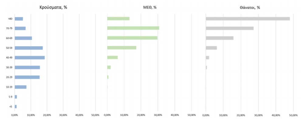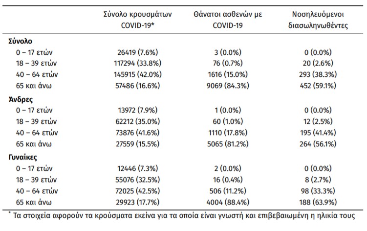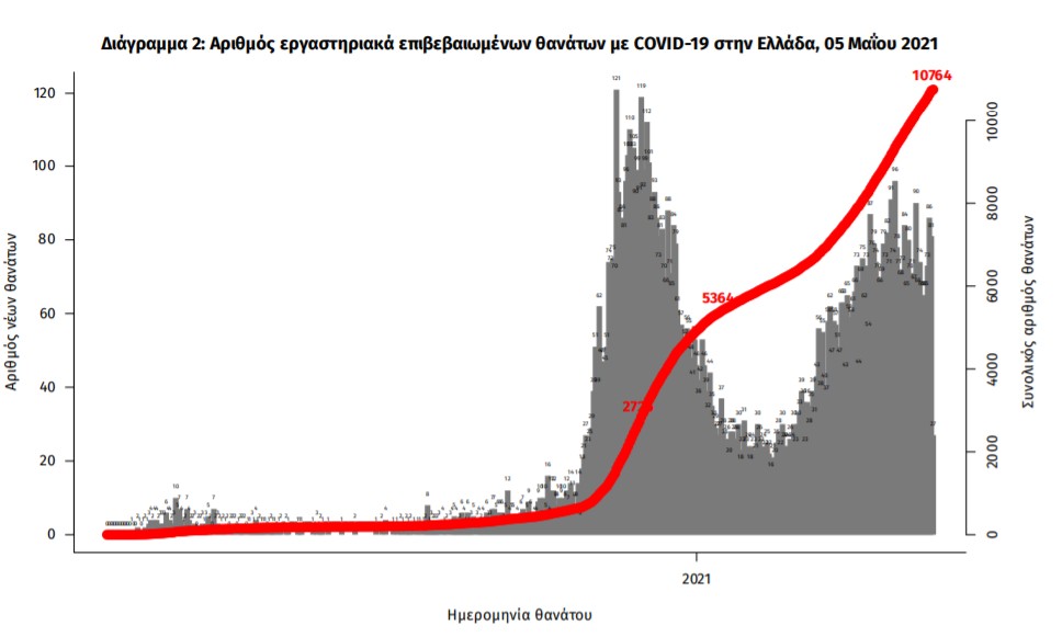 Οι νέοι θάνατοι ασθενών με COVID-19 είναι 96, ενώ από την έναρξη της επιδημίας έχουν καταγραφεί συνολικά 10.764 θάνατοι. Το 95.3% είχε υποκείμενο νόσημα ή/και ηλικία 70 ετών και άνω.