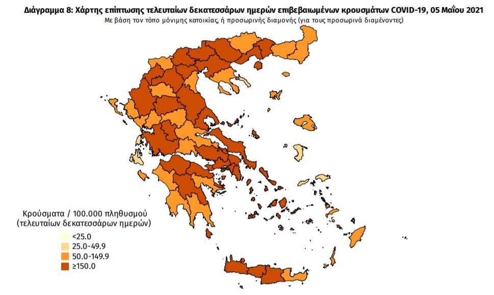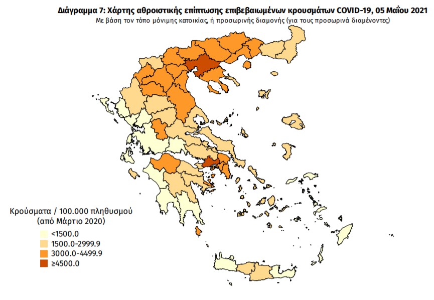 Ο χάρτης αποτυπώνει τη γεωγραφική κατανομή των συνολικών κρουσμάτων COVID-19 (από την αρχή της επιδημίας) ανά Περιφερειακή Ενότητα της χώρας, με βάση την δηλωθείσα διεύθυνση μόνιμης κατοικίας του ασθενούς, ή τη διεύθυνση προσωρινής διαμονής για τους τουρίστες και άλλους προσωρινά διαμένοντες στην Ελλάδα. Συμπεριλαμβάνονται τόσο κρούσματα με ιστορικό ταξιδίου (“εισαγόμενα”) όσο και κρούσματα με πιθανή εγχώρια μετάδοση.