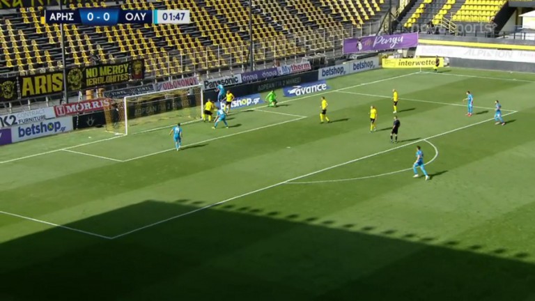 Μια ανάσα από το γκολ έφτασε ο Ολυμπιακός στο παιχνίδι με τον Άρη, μόλις δύο λεπτά μετά το ξεκίνημα του ματς.