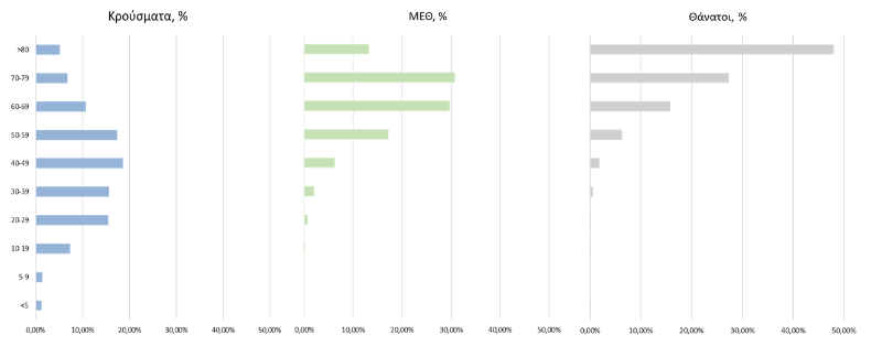 Ηλικιακή Κατανομή κρουσμάτων, νοσηλευόμενων στις MEΘ και ασθενών που απεβίωσαν από την αρχή της πανδημία