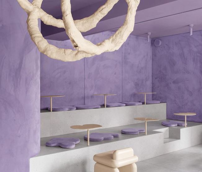 Tοίχοι, καλυμμένοι με βελούδο στο χρώμα του μωβ μούρου· μαξιλαράκια στο ίδιο χρώμα, από το ίδιο υλικό και σε σχήμα σταγόνας που έχει πέσει πάνω σε βαθμίδες από τσιμέντο όπου θα στρογγυλοκαθίσουν οι πελάτες γύρω από ακανόνιστου σχήματος τραπεζάκια που μοιάζουν με δυσδιάστατες σταλαγματιές κρέμας.