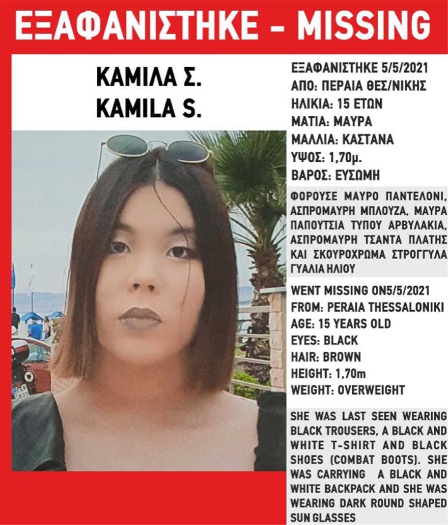 Συναγερμός έχει σημάνει στις Αρχές καθώς εξαφανίστηκε στις 5/5/2021 στις 20:00, από το σπίτι της στην Περαία Θεσσαλονίκης, η Καμίλα Σ., 15 ετών, με καταγωγή από το Καζακστάν.