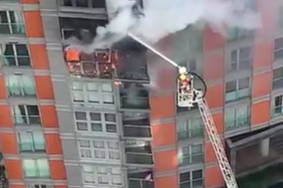 Στις φλόγες έχουν τυλιχτεί τμήματα του 8ου, του 90υ και του 10ου ορόφου του κτιρίου, ενώ πυκνά σύννεφα καπνού έχουν τυλίξει την ευρύτερη περιοχή