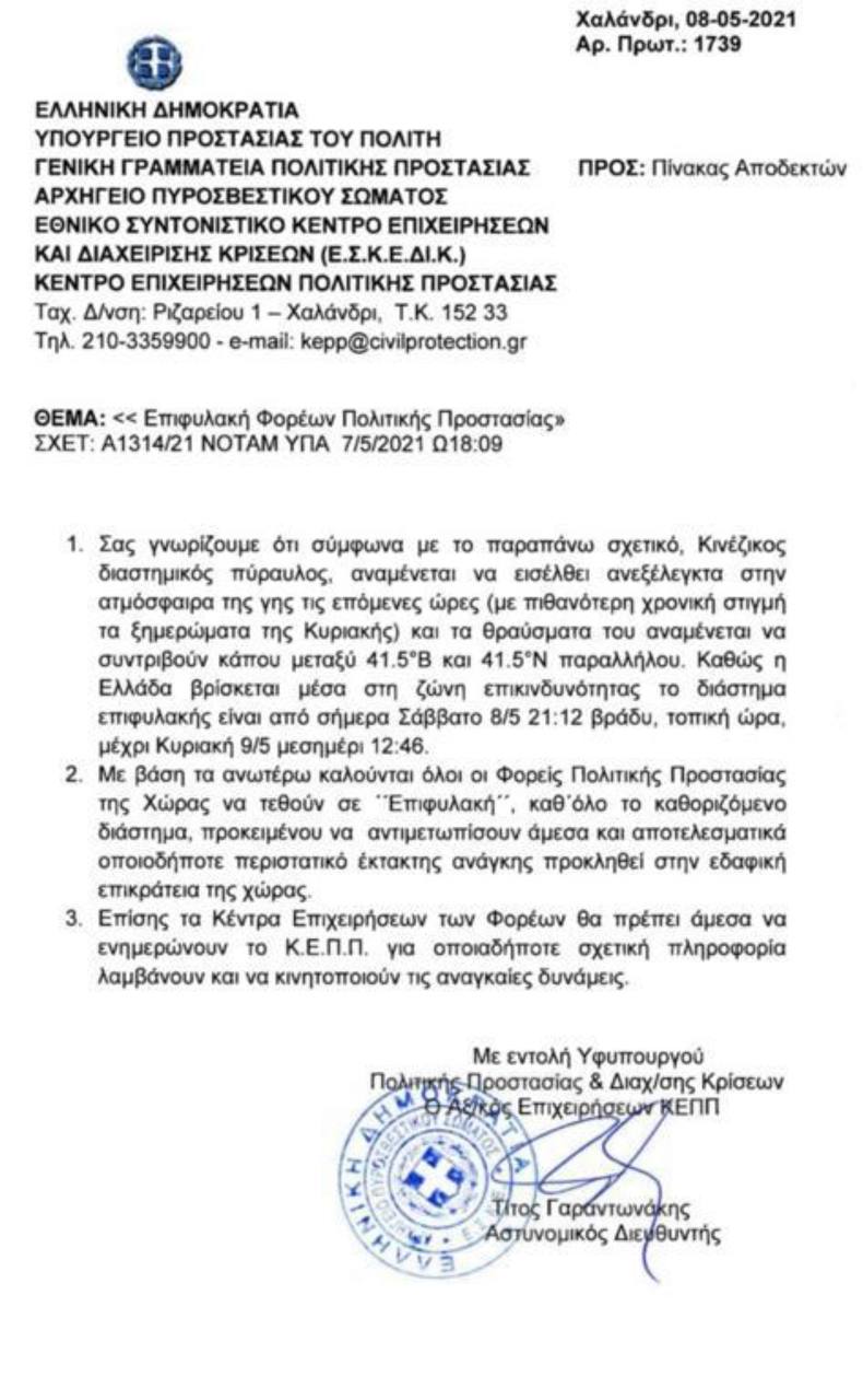 «Με εντολή του υφυπουργού Πολιτικής Προστασίας και Διαχείρησης Κρίσεων, Νίκου Χαρδαλιά, τίθενται σε επιφυλακή όλοι οι φορείς Πολιτικής Προστασίας από σήμερα, Σάββατο 8/5 21:12 μέχρι αύριο, Κυριακή 9/5 μεσημέρι 12:46, διότι ο Κινεζικός Πύραυλος αναμένεται να εισέλθει ανεξέλεγκτα στην ατμόσφαιρα της Γης (με πιθανότερη χρονική στιγμή τα ξημερώματα της Κυριακής) και τα θραύσματα του αναμένεται να να συντριβούν κάπου μεταξύ 41,5 Β και 41,5 Ν παραλλήλου και η Ελλάδα βρίσκεται μέσα στη ζώνη επικινδυνότητας».