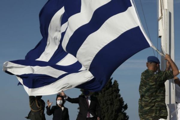 Ο Μαργαρίτης Σχοινάς μάλιστα έσπευσε να προστατεύσει την ΠτΔ που κινδύνευσε από την… τεράστια ελληνική σημαία που παραλίγο να πέσει πάνω της.