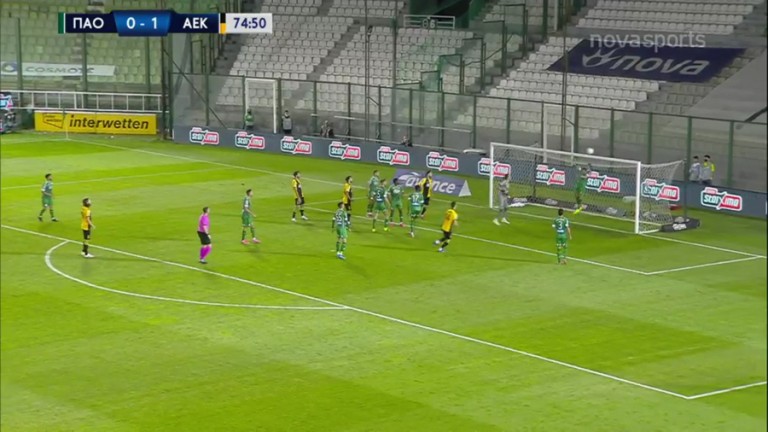 Πολύ μεγάλη ευκαιρία για το 2-0 έχασε η ΑΕΚ στο 75ο λεπτό του ντέρμπι με τον Παναθηναϊκό.