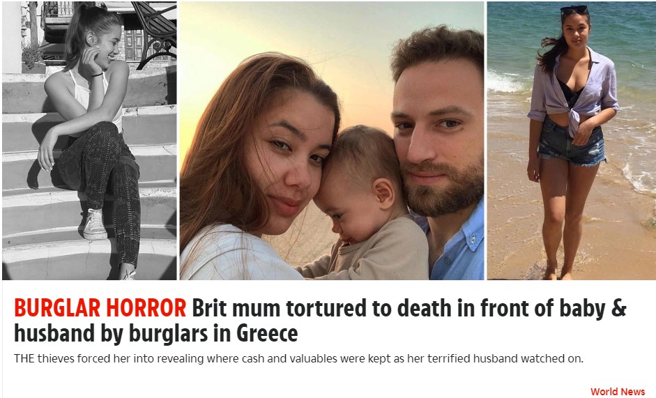 Η εφημερίδα Sun γράφει: Μια Βρετανίδα μητέρα βασανίσθηκε μέχρι θανάτου μπροστά στην 11 μηνών κόρη της από ληστές που εισέβαλαν στο σπίτι της στην Ελλάδα.