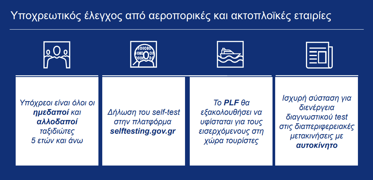 Ο έλεγχος θα γίνεται από αεροπορικές και ακτοπλοϊκές εταιρείες. Υπόχρεοι θα είναι όλοι οι ταξιδιώτες 5 ετών και άνω. Η δήλωση του self test θα γίνεται στην πλατφόρμα selftesting.gov.gr. Το PLF θα εξακολουθήσει για εισερχόμενους τουρίστες.
