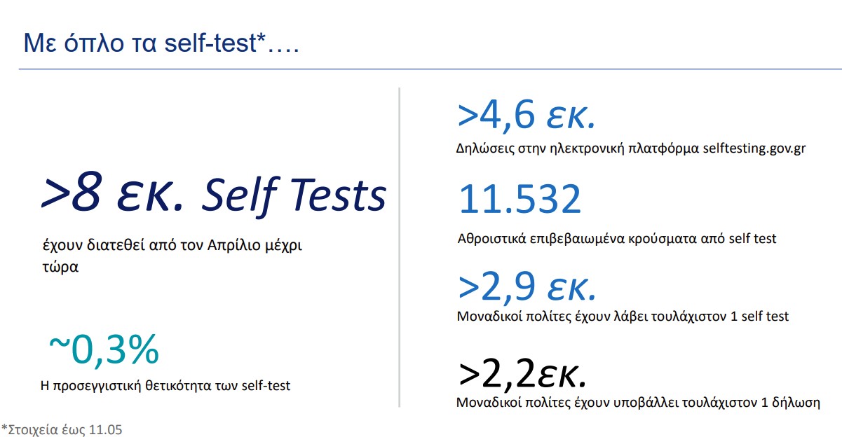 Επιπλέον υπογράμμισε πως ήδη έχουν διατεθεί πάνω από 8.000.000 δωρεάν self tests, από τα οποία προέκυψαν 11.532 θετικά κρούσματα, τα οποία -εφόσον στην πλειοψηφία τους αφορούσε σε ασυμπτωματικούς πολίτες- δεν θα γίνονταν έγκαιρα αντιληπτά και η διασπορά του ιού θα ήταν μεγαλύτερη στην κοινότητα.