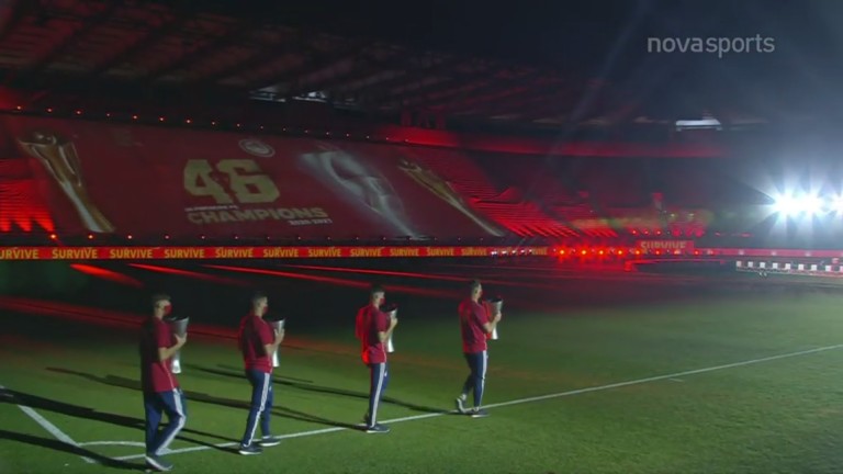 Λίγο πριν μπει μέσα στο γήπεδο η «φρέσκια» κούπα, έκαναν την είσοδο τους τα προηγούμενα 45 πρωταθλήματα που έχει κατακτήσει ο σύλλογος του Πειραιά όλα αυτά τα χρόνια.
