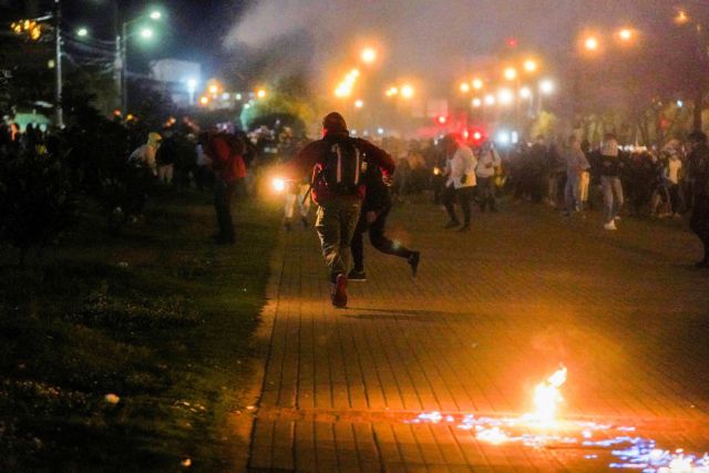 Διαδηλωτές τρέχουν για ν’ αποφύγουν τα δακρυγόνα της αστυνομίας, στην πρωτεύουσα Μπογοτά (φωτογραφία Reuters/NathaliaAngarita)