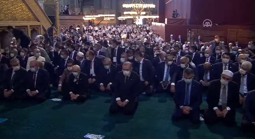 Κυριολεκτικά ανατρίχιασα, αντικρύζοντας στα χτεσινά video της τηλεόρασης, έναν εσμό από «φερτούς» μουσουλμάνους, να προσκυνούν, με τις γνωστές ομαδικές επικύψεις στην προσευχή τους, τον …μοναδικό θεό της Αγίας Σοφίας, τον Αλλάχ (έτσι γράφει η ανόητη φωτεινή επιγραφή στο προαύλιο) και να ζητούν την εξ ύψους παρηγορίαν, καταμεσίς στο μοναδικό στον κόσμο μνημείο ασύγκριτης Τέχνης και χριστιανικής λατρείας. Στο ναό της του Θεού Σοφίας!