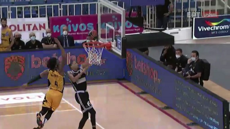 Με 33.5» να απομένουν για να λήξει η αναμέτρηση ανάμεσα σε ΑΕΚ και ΠΑΟΚ και τη διαφορά να είναι στους τέσσερις πόντους, ο Λοβ έκλεψε την μπάλα από τον Μέικον, βγήκε «φάτσα» με το καλάθι και έκανε το lay-up με την μπάλα να χτυπάει στο ταμπλό και στη συνέχεια να απομακρύνεται από τον Αμερικανό άσσο της ΑΕΚ.