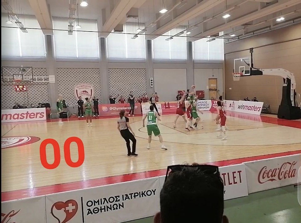 Στο αριστερό μέρος της φωτογραφίας φαίνεται το ταμπλό και το χρονόμετρο, το οποίο έχει μηδενίσει όταν η μπάλα βρίσκεται ακόμα στα χέρια της παίκτριας του Τριφυλλιού.