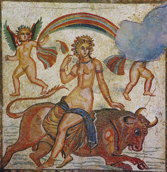 Το ψηφιδωτό με την παράσταση της αρπαγής της Ευρώπης, διαστάσεων 2,06 χ 2,00 μ., είναι το κεντρικό θέμα του ενός ψηφιδωτού (ψηφοθετημένου) δαπέδου. Η Ευρώπη αποδίδεται ως γυμνή νεαρή γυναίκα καθισμένη επάνω στον μεταμορφωμένο σε ταύρο Δία, σε κίνηση προς τα δεξιά, ενώ δύο φτερωτοί ερωτιδείς συγκρατούν το ιμάτιό της, θυμίζοντας παραστάσεις της θαλάσσιας Αφροδίτης. Πρόκειται για ένα σπάνιο εικονογραφικό σχήμα που καθιστά το ψηφιδωτό ιδιαίτερο. Το ψηφιδωτό με την παράσταση του Ορφέα, διαστάσεων 1,40 χ 1,13 μ., απεικονίζει τη μυθική φιγούρα του Ορφέα με τη λύρα του να σαγηνεύει τα ζώα, τα πτηνά και ερπετά.