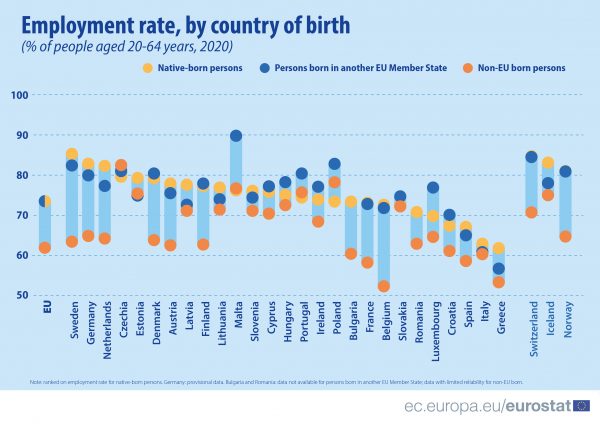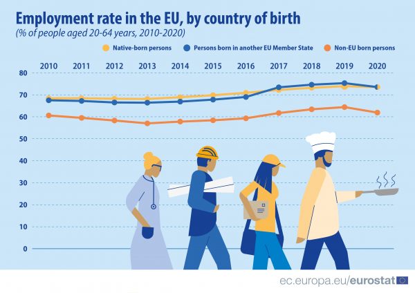 Ειδικότερα, σύμφωνα με την Eurostat το ποσοστό απασχόλησης στην Ε.Ε. για άτομα ηλικίας 20 έως 64 ετών ήταν 61,9% για όσους δεν είχαν γεννηθεί στην ΕΕ και 73,5% για άτομα που γεννήθηκαν σε άλλο κράτος μέλος της ΕΕ, καθώς και για τον πληθυσμό που γεννήθηκε στη χώρα αναφοράς.