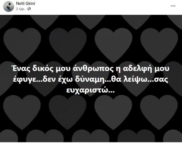 «Ένας δικός μου άνθρωπος, η αδελφή μου έφυγε, δεν έχω δύναμη, θα λείψω, σας ευχαριστώ», έγραψε χαρακτηριστικά η Νέλλη Γκίνη, με τους διαδικτυακούς της φίλους να σπεύδουν να τη συλλυπηθούν.